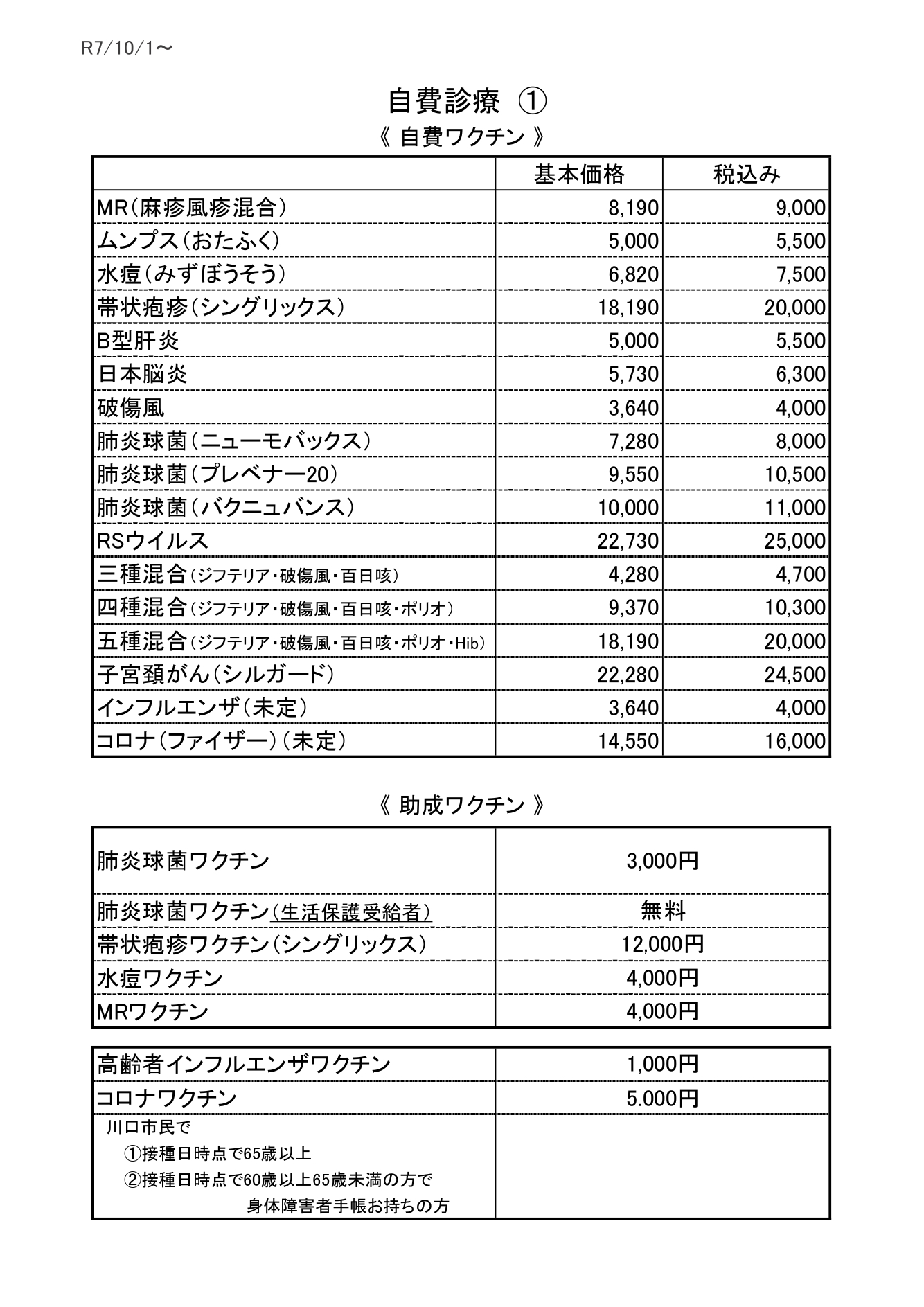 保険外診療(公的な医療保険がきかない医療行為)、検査、ワクチン、各証明書・文書作成料など、実費のご負担となります。 以下は、院内に掲示している一覧表の内容です。 掲示内容は、予告なく変更いたします。予めご了承ください。