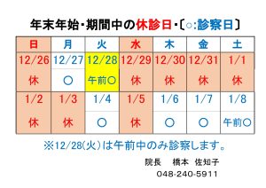 2021年12月28日(火)午後〜2022年1月3日(月)の間、休診とさせていただきます。 ご迷惑をおかけいたしますが、よろしくお願いいたします。